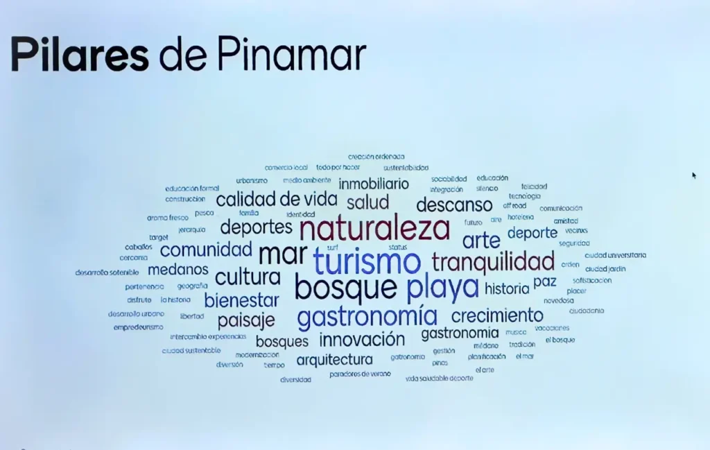 Durante la charla se realizó una interacción con el público mediante tecnología. La consigna fue precisa: cuáles son los pilares que sostienen Pinamar. La mayoría coincidió en una serie de activos: la naturaleza, el bosque, la playa, el mar, la cultura y el deporte.